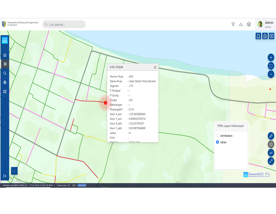 SmartGIS PU merupakan sebuah aplikasi Sistem Informasi Geografis (SIG) untuk Dinas PU di daerah dengan berbasis Web GIS yang lebih modern & aplikatif, sangat bermanfaat untuk digunakan di dinas PU, aplikasi ini menyajikan informasi data jalan dan jembatan secara spasial maupun detail atribut, sehingga dapat membantu dalam menentukan keputusan dikegiatan pengelolaan data jalan dan jembatan, dengan lebih efisien dan efektif serta akurat. Dengan adanya dukungan dari aplikasi ini, maka perusahaan air minum di daerah dapat dianalisa dan ditunjukan secara akuntabilitas dan akurat secara letak posisi objeknya.